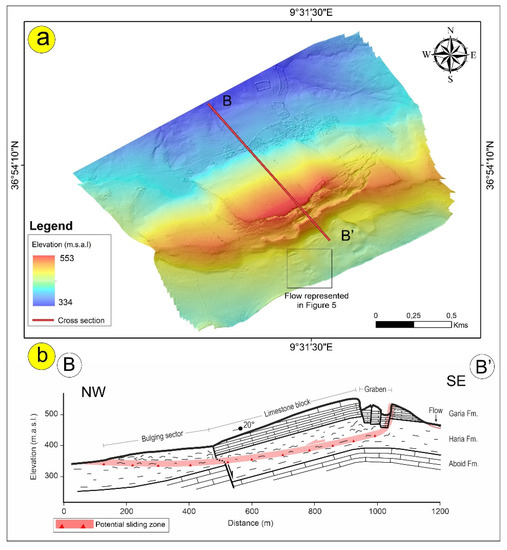 We infer that the viscoplastic creep of the clay terrains of the Haria Formation subjacent to the limestones with 20° dip to the NW permitted the lateral expansion of the latter, creating the large graben in the landslide crown as well as the bulge at its toe—two typical features of rock spreading according to Pasuto and Soldati [3] (Figure 15). The failure plane would accordingly be located inside the Haria Formation and may crop out alongside the boundary of the bulge observed in the landslide toe (Figure 8 and Figure 15). Therefore, it appears that (1) the soft terrains of the Haria Formation are the ones that have failed; (2) their movement caused the fracturing process of the Garia limestone, producing the graben of the landslide crown and the individualization of a large limestone block; and (3) this limestone block was initially set in motion, i.e., dragged, by the underlying clay and marls to eventually become part of the slide mass (Figure 15).