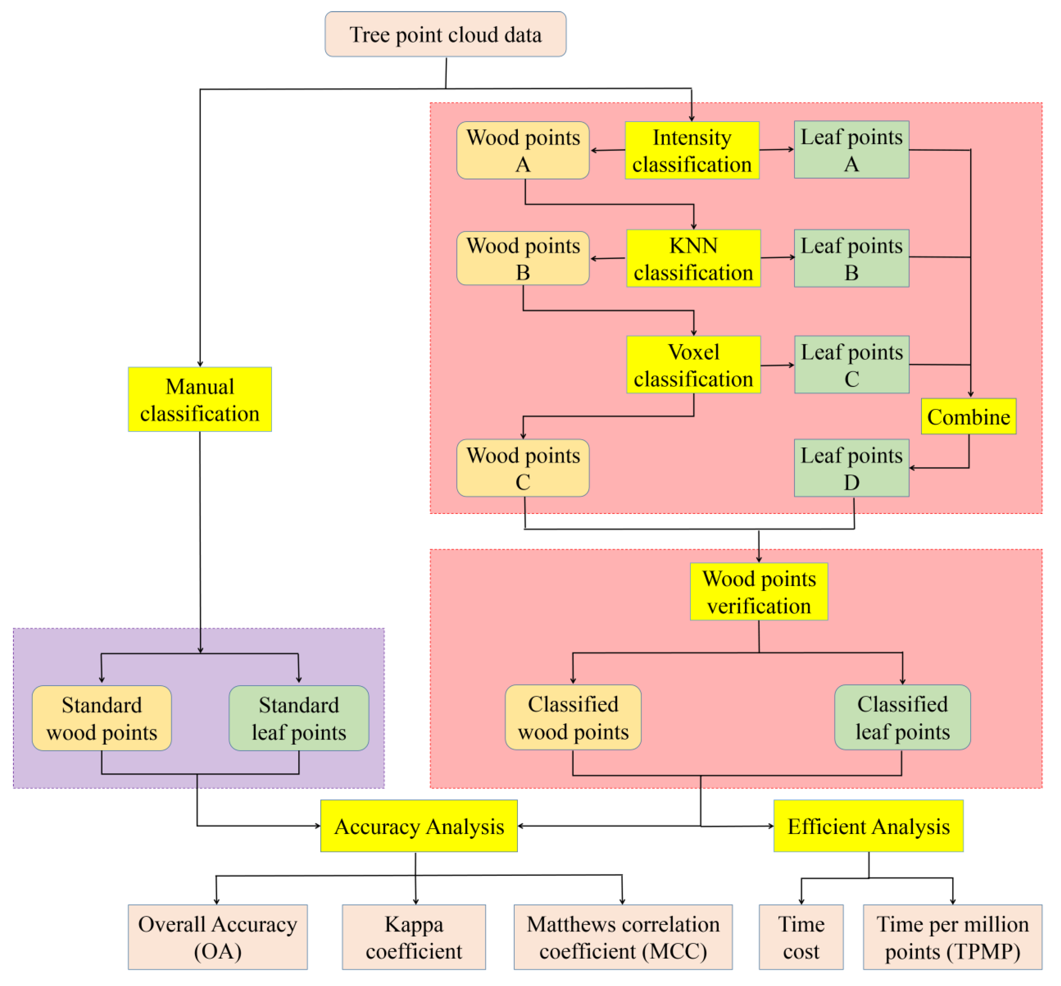 - Wang, D.; Momo Takoudjou, S.; Casella, E. LeWoS: A Universal Leaf-wood Classification Method to Facilitate the 3D Modelling of Large Tropical Trees Using Terrestrial LiDAR. Methods Ecol. Evol. 2020, 11, 376–389. [Google Scholar] [CrossRef]
