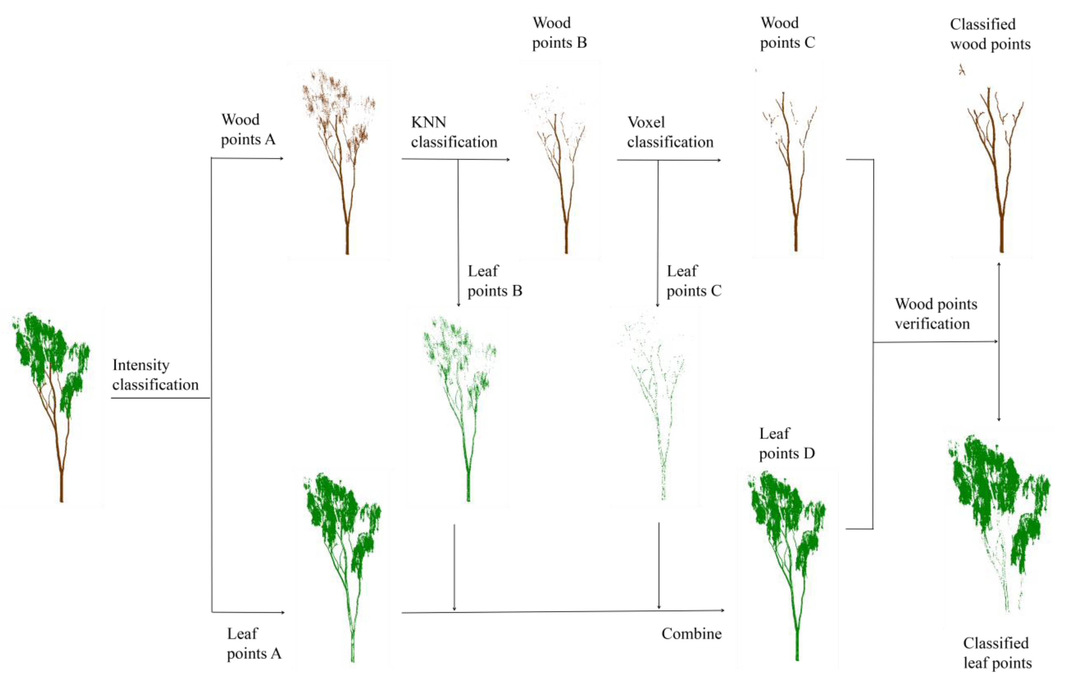 Sun, J.; Wang, P.; Gao, Z.; Liu, Z.; Li, Y.; Gan, X.; Liu, Z. Wood–Leaf Classification of Tree Point Cloud Based on Intensity and Geometric Information. Remote Sens. 2021, 13, 4050. https://doi.org/10.3390/rs13204050