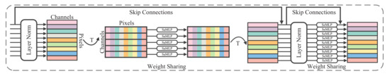 The architecture of the SS-MLP block is shown in Figure 3. It simply contains two types of MLP: spatial MLP (SaMLP) and spectral MLP (SeMLP). SaMLP acts on each channel independently. It takes individual column of the table as input to capture representative spatial features. The SaMLP allows communication between pixels at different spatial locations, achieving a global receptive field in the region. In other words, each pixel is cognizant of every other pixel in the sequence. SeMLP operates on each pixel independently, allowing communication between different channels. It takes individual row of the table as input to extract discriminative spectral features. By integrating the SaMLP and SeMLP, discriminative spectral–spatial features can be extracted from HSI cubes. In addition, we adopt the skip connection mechanism of [44] to enhance information exchange between layers, which has been demonstrated to be an effective strategy for modern neural architecture design [45,46,47].