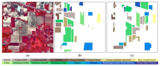 AVIRIS Indian Pines (IP) hyperspectral dataset with 200 bands across the spectral range from 0.4 to 2.5 m. (a) False-color composite image for the hyperspectral data using bands 37, 20, and 12 as R, G, B, respectively. (b) Training samples. (c) Test samples.