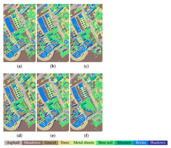 Classification maps on the UP dataset. (a) DenseNet, OA = 91.33%. (b) FDMFN, OA = 91.63%. (c) MSRN, OA = 91.94%. (d) DPRN, OA = 92.28%. (e) SSSERN, OA = 94.63%. (f) SS-MLP, OA = 96.23%.