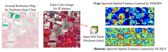 In addition, for the IP dataset, the classification accuracies obtained by our method are similar to that achieved by SSSERN in most categories. However, our SS-MLP achieves significant improvements over SSSERN in the “Soybean-clean” category (58.98 ± 9.36 vs. 20.89 ± 6.41). The “Soybean-clean”, “Soybean-notill”, and “Soybean-mintill” categories are similar, which make accurate separation difficult. For “Soybean-clean” category, all methods obtain poor accuracy (lower than 60%). However, the proposed SS-MLP can achieve a better classification performance compared with other methods, possibly since global information is important for accurately classifying this category with large-scale areas. Without the help of global receptive field, pixels inside large objects are usually mistaken as other objects with high similarity. Figure 12 shows the features learned by SSSERN model and the proposed SS-MLP. Note that the final spectral-spatial features extracted before global average pooling are displayed. As can be seen, our SS-MLP tends to focus on pixels in different areas of the input HSI patch and hence can reason in an enlarged spatial range and from a global prospective. However, SSSERN pays more attention on local information. Therefore, we hypothesize that the success of detecting this category arises from the SS-MLP’s characteristic of global receptive field.