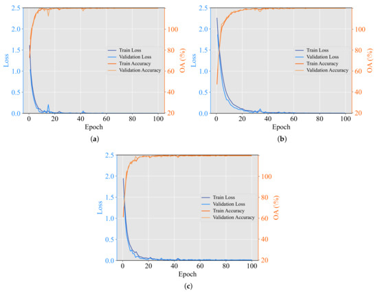 Learning curves of the proposed SS-MLP on (a) UP, (b) UH, and (c) IP datasets. As can be observed, our model has the characteristic of fast convergence, which can converge at a stable minimum within as few as 50 epochs for these three datasets.