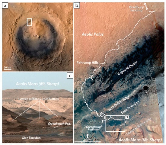 Localization of the studied area on Mars. (a) Orbital image of the Gale crater. The white box represents the area of operations of the Curiosity rover. (b) View of path followed by the rover (white line) since Bradbury landing in August 2012 and up to the lower sulfate unit transition (as of July 2021). (c) Panoramic view from Aeolis Palus (Photo-journal image PIA19912, https://photojournal.jpl.nasa.gov/catalog/PIA19912, accessed on 8 August 2021) showing the vertical succession of the major units in Mount Sharp stratigraphy, notably highlighting the location of Glen Torridon region and the lower sulfates unit.