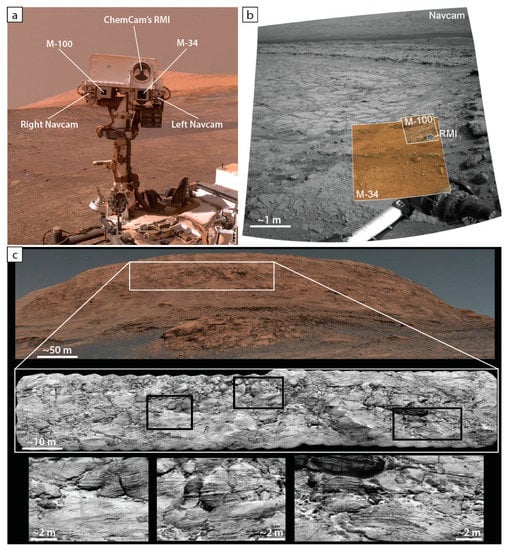 The Curiosity rover is equipped with 17 cameras serving multiple purpose from determining trafficability along its traverse to multi-scale scientific observations for scientific remote sensing investigations; we mainly use the five cameras situated on the 2-m high Remote Sensing Mast (RSM) of the rover: the Navcam pair, the Mastcam pair, and ChemCam’s RMI (Figure 2a). The Navcam pair provide wide-angle stereo greyscale imagery (Table 1; Figure 2b) that can be used to produce close to mid-range 3D models of the rover’s surroundings [3,12,20]. The Mastcam pair provide high-resolution color imagery (Table 1; Figure 2b) to allow detailed scientific observations [4,5]. These cameras can be operated to obtain stereo mosaics [21] or even 3D DOM [12] but, contrary to the Navcam pair, their different focal length leads to a restricted field of acquisition of the 3D information. Finally, the RMI is a sub-system of the ChemCam instrument. Its main role is to image the targets analyzed by the Laser-Induced Breakdown Spectrometry [6,22], allowing close inspection of the analyzed rock (Figure 2b), its texture, and the markings left by the laser shots. Whereas RMI was not originally designed to observe at long distance, its 700 mm focal length appeared to be useful when pointing the telescope at remote objects (Table 1; [7]). In that role, the RMI can produce highly detailed greyscale views of outcrops up to several kilometers away (a ~60 km-record observation having recently been achieved [23]). As the pixel size of the RMI is 3.7× smaller than that of the M-100 [7], this instrument provides a complementary imaging capacity of the distant geological features with a very high resolution, but with a reduced field of view. The white box in the color Mastcam mosaic of Figure 2c (upper panel) highlights the area imaged by a composite RMI mosaic made from two merged observations (15 × 3 and 10 × 3 mosaics, lower panel in Figure 2c). With RMI, it is possible to see more details, such as meter-scale cross-stratifications and individual blocks highlighted in the detail boxes at the bottom of Figure 2c, that were not visible on the Mastcam image. This capacity is critical to characterize structures from long-distances and/or of outcrops inaccessible for the rover. However, unlike the Navcam and Mastcam pairs, the RMI is not natively capable of generating stereo-images to provide a 3D view of the imaged outcrops.