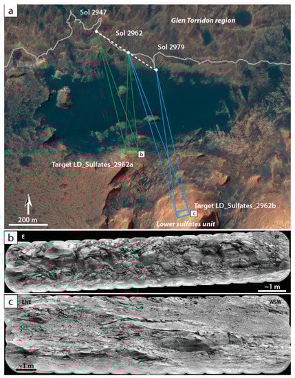 The first outcrop (LD_Sulfates_2962a on Figure 3a, illustrated in Figure 3b) was imaged on Sol (mission Martian day) 2947 and on Sol 2962 by mosaics labeled LD_Sulfates_2947b and LD_Sulfates_2962a, respectively (Table 1). The outcrop is situated between ~510 and ~650 m away from the rover, with a virtual baseline of ~200 m (Table 1, Figure 3a).
