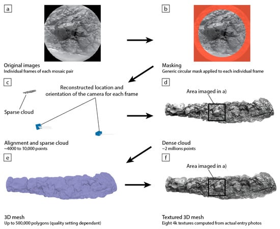 To obtain a more accurate and realistic representation, a texture is computed for the mesh using the original entry images. In this case, a texture made from eight tiles of 4096 × 4096 pixels have been generated and UV-mapped onto the 3D mesh to obtain a photorealistic representation of the actual distant outcrop (Figure 4f). With RMI, the texture is greyscale due to the entry images being so. However, further work is planned to test if RMI frames colorized with Mastcam images using pan-sharpening [7] could be used to produce a full color texture and therefore improve the final 3D product.