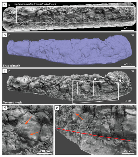 Thanks to the 3D reconstruction of the model, it is possible to see that sub-metric cross-stratification is quite widespread on the outcrop, and not affected by the several deflation surfaces. This area also presents some structures in the form of arcuate lineations protruding out of some blocks (orange arrows in Figure 5d,e). Here, the 3D mesh representation allows observation of the spatial distribution of these features, and they seem to crosscut the apparent stratal pattern of the entire outcrop. These structures might be interpreted as mineral veins likely of diagenetic origin. A close observation of the topographic expression of the outcrop rendered in 3D allows the viewer to identify the possibility that a contact, hardly seen on the mosaic, continues farther to the left. Indeed, the contact observed at the base of the right part of the outcrop is easily identifiable at the base of the biggest blocks (right Figure 5a,d). However, its continuity is more difficult to assess in the rubblier part on the left. The 3D mesh, however, lets us observe a topographic “step” in this rubblier part (as seen in differential shading in Figure 5b), allowing the viewer to trace the continuity of this contact down to the limits of the model (red line in Figure 5d).