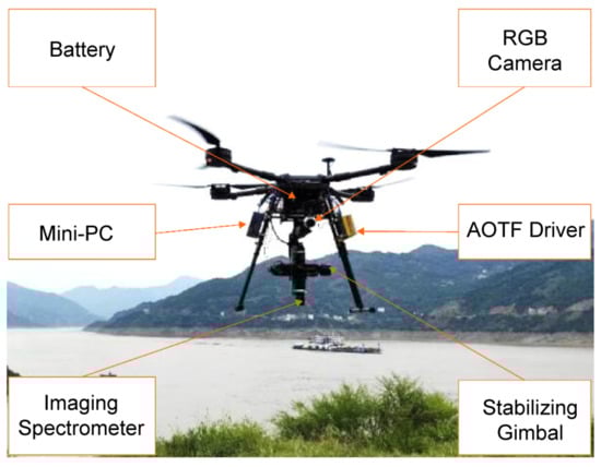 To meet the needs of spectral imaging analysis of water quality parameters in water remote sensing, this paper introduces UAV hyperspectral remote sensing systems based on AOTF as a solution and its application in water quality monitoring. First, the construction and calibration of a hyperspectral imager system for UAV are introduced. Second, this paper describes the remote sensing data acquisition control and data processing flow of the system and introduces geometric registration, radiation calibration, field-of-view splicing, and concentration inversion of the collected data in detail. Then, air–ground joint water quality monitoring experiments in the Three Gorges demonstration area and Poyang Lake demonstration area are introduced, including remote sensing imaging of the water bodies, in situ sampling test of water quality parameters, measurement of water-leaving reflectance and image registration, mosaic, and radiation calibration of remote sensing data. Taking water quality parameter Chl-a as an example, this study analyzes and compares 11 traditional Chl-a sensitive spectrum selection algorithms, and accordingly analyzes and compares the water quality parameter concentration prediction models established by a conventional regression algorithm, neural network algorithm, and machine learning algorithm. Finally, the application of the system is analyzed and discussed. At the same time, the existing problems and application potential of the AOTF-based UAV hyperspectral remote sensing system in water remote sensing imaging spectral analysis are briefly discussed.