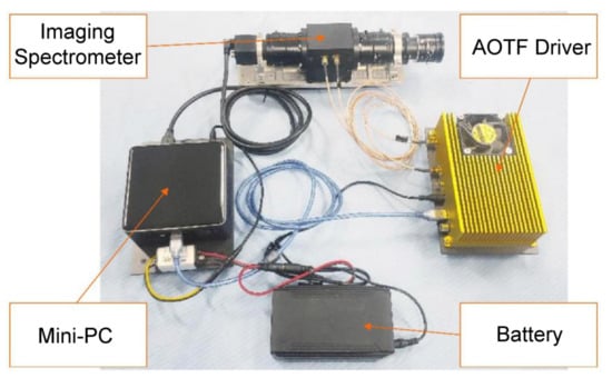 Components of the AOTF imaging system: AOTF imaging Spectrometer, a AOTF Driver, a MINI-PC, a LiPo battery.