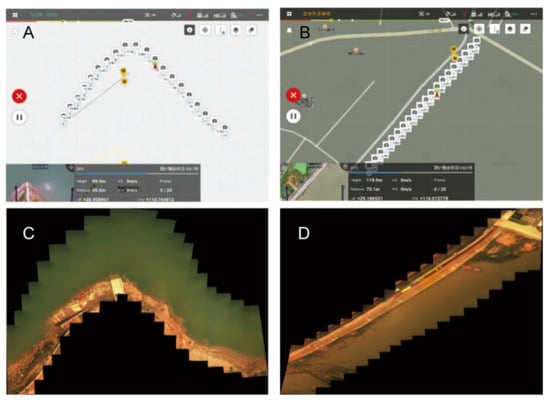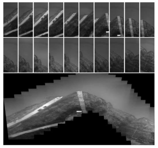 In the present study, the flight altitude of the UAV was set to 100 m, and the aperture size of the field of view was 10 mm × 3.2 mm. To ensure a high imaging spatial resolution, the focal length of the front objective lens was 12 mm, so that the ground field of view was 83 m × 26 m. To meet the basic conditions of field-of-view splicing, two adjacent fields of view must have more than a half of each of their fields overlapping according to the relevant technical specifications for aerial photography [63,64,65]. Generally, the course overlap rate is 53–65%, while the side overlap rate is 15–40%. In practical applications, the heading and side overlap rates should be appropriately increased to ensure the quality of the image mosaic in a large field of view with relatively few surface features. Therefore, when setting the waypoint, the distance between the two waypoints should not be greater than 15 m.