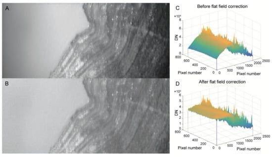 Generally, an integrating sphere is used as a uniform radiation source in the flat-field correction process. An Xth-2000 large aperture integrating sphere of Labsphere (Sutton, NH, USA) was used in the present study. Figure A3 in Appendix A presents a schematic diagram of laboratory calibration.