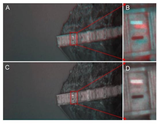 Image distortion and motion artifacts, which considerably influence the accuracy of target recognition, are the challenges encountered during the application of spectral scanning imaging spectrometers in remote sensing applications [22]. In UAV hyperspectral cameras based on AOTF, three major reasons for the distortion and motion artifacts observed in the imaging processes exist. (1) There are optical system design errors and assembly errors of the spectral imager [23], which are similar to the case in ordinary cameras. (2) In remote sensing flight tests, the positions and altitudes of sensors change due to airflow disturbance and UAV vibration, resulting in spatial position deviation of different spectral segments, and different spectral bands cannot be completely matched in the original data cube; therefore, registration correction should be considered during post-processing. (3) The diffraction phenomena of beams in AOTF crystals caused by ultrasonic waves vary at different wavelengths [24]. The diffraction problem is attributable to the AOTF spectral camera, and there is no dedicated mathematical model to resolve it; however, AOTF crystals have been calibrated before they leave the factory, which is not within the scope of this paper.