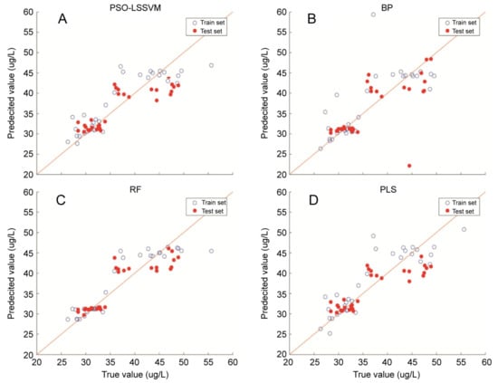 To establish the water quality parameter prediction model, we employed various methods, such as the partial least squares (PLS) algorithm [33], neural network methods (e.g., BP) [38,85], machine learning methods (e.g., least squares support vector machine based on particle swarm optimization algorithm (PSO–LSSVM)) [37,86], and the random forest (RF) algorithm [87,88,89,90].