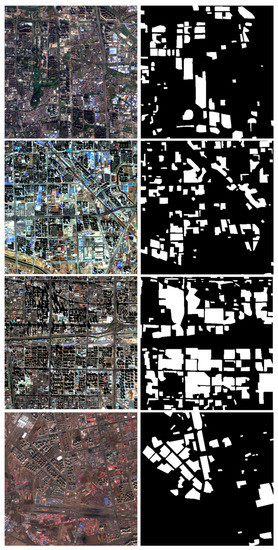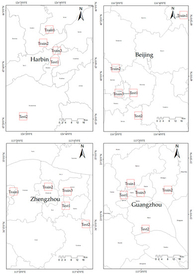 Four capital cities namely Harbin, Beijing, Zhengzhou, Guangzhou ranging from north to south in China were selected as study regions as illustrated in Figure 1. Four cities have experienced extensive urbanization processes in the past decades; meanwhile, they are diverse from each other on many aspects such as latitude, climate, and landscape. According to Köppen climate classification, Harbin and Beijing belong to the Dwa, while Zhengzhou and Guangzhou pertain to Cwa. Thus, the selected regions provide a very good testbed for the validation of the effectiveness of the FCN-based method on HRBs detection. Fives typical areas were chosen for HRB sample collection in each region. Both urban center and suburban areas are considered in the selection. Each area covers about 5 km × 5 km. Among the five areas, three are used to train the FCN-based model while the other two are used as independent validation data. All selected sample areas and their corresponding regions are shown in Figure 2.