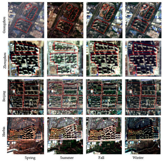 True-color images of patches selected from four cities and four seasons, and red rectangles refer to HRBs in the patches.
