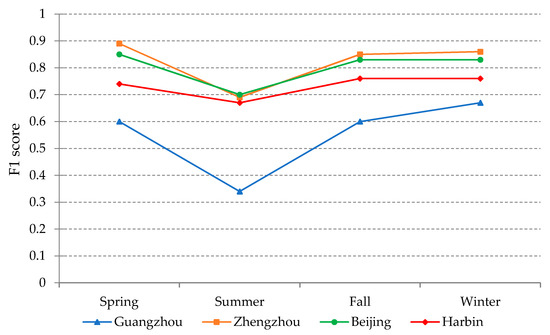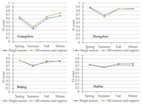 As can be seen from Figure 9, single-season FCN models are close to all-seasons-and-regions models in terms of overall accuracy except the results in Guangzhou. The differences between the single season models and all seasons-and-regions models vary slightly among the four regions. More specifically, the accuracy of the all-seasons-and-regions model is consistently better than single-season models in Guangzhou, and the average difference is about 0.05. Single-season models perform slightly better than the corresponding all-seasons-and-regions models in Zhengzhou and Harbin, especially in spring and summer for Zhengzhou and in fall and winter in Harbin. In Beijing, the difference fluctuates at a small range in summer and fall. From Figure 6, Figure 8, and Figure 10, the all-seasons-and-regions models achieve similar results as the single-season model and the all-season model do. Both of the results are similar to the ground truth in terms of spatial distribution. The differences among the three group of results as indicated in Figure 9 cannot be easily observed through visual interpretation due to the spatial cluster property of the HRBs. Nevertheless, one thing in common is that the uncertainties of the results mostly lie on the boundary of detected HRBs.