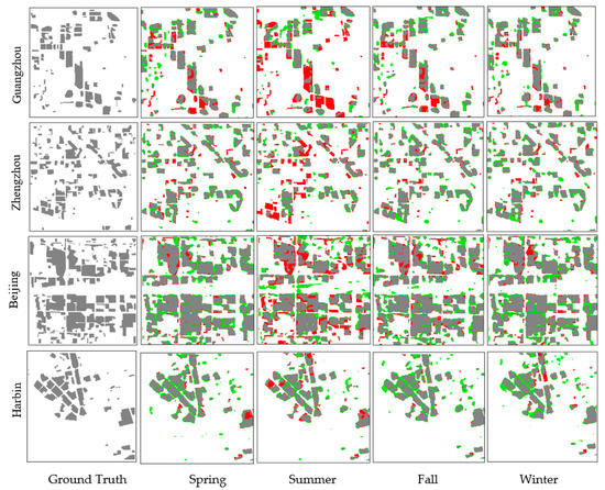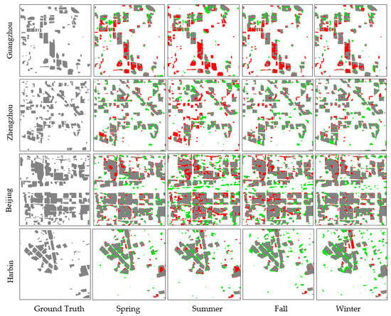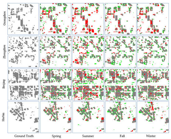 As can be learned from Figure 7, single-season models are slightly better than their corresponding all-season models in terms of overall accuracy in most cases. The differences between single-season models and all-season models vary among four regions. More specifically, the differences in Guangzhou are tiny in all four seasons; results in Beijing follow the same trend in Guangzhou except a small amount of difference in fall; Zhengzhou has the most distinct difference at about 0.2 in summer, while differences are small in other seasons; the differences in fall and winter in Harbin are about 0.1. From Figure 6 and Figure 8, all-season models achieve similar results as single-season models. The results are similar to the ground truth in terms of spatial distribution. The uncertainties also lie on the boundary of detected HRBs in the results.