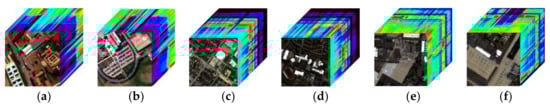 Experimental data sets. (a) Training image of University of Pavia; (b) Testing image of University of Pavia; (c) Training image of University of Houston; (d) Testing image of University of Houston; (e) Training image of San Diego air station; (f) Testing image of San Diego air station.