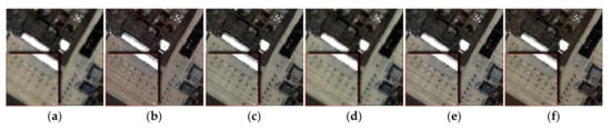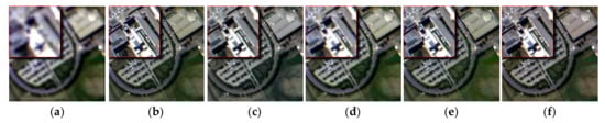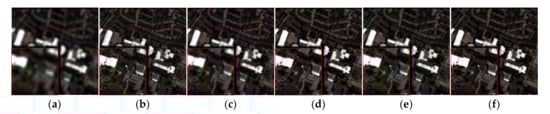 Figure 3, Figure 4 and Figure 5 show the R/G/B color composited images of super-resolved results under . Obviously, compared with the references in Figure 2, it can be seen that the bicubic interpolated images commonly have vague edges and blurred details. Undoubtedly, using CNN-based super-resolution approaches indeed enhances the visual details. For instance, we can clearly observe the boundaries and textures of some buildings in the local enlargements. In other words, the spatial resolutions of the HS images have been truly enhanced. From Figure 4, we can also see some subtle differences from the local enlargements, e.g., the second boundary inside the white building can only be observed in Figure 4b,d,f, which indicates that that 3DFN, IRFN, and UCNN have preferable performance in terms of spatial clarity as well.