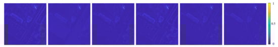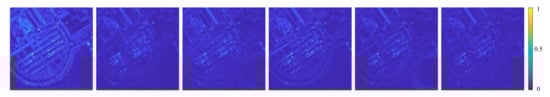 The overall error maps for different methods are displayed in Figure 6, Figure 7 and Figure 8, which show the absolute values of errors between the super-resolved images and reference images and plot the band average values via the pseudo-color images. For convenience, the values are normalized by the same maximum number for each data set. From these figures, it can be seen that the bicubic method always suffers from large errors, especially at the edges of ground objects, as expected. In contrast, using deep learning techniques, especially the proposed UCNN approach, can effectively reduce the reconstruction errors, as Figure 6, Figure 7 and Figure 8 show, and more importantly, it can enhance the spatial resolution of the images, thereby presenting better appearance and clarity of objects.
