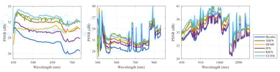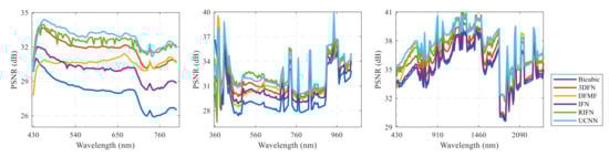 Finally, aside from the comparison of spatial clarity in Figure 6, Figure 7 and Figure 8, a brief comparison from the band dimension is exhibited in Figure 9, in which we plot the PSNRs for each band of these super-resolved images. It can be seen that, essentially, the proposed approach has the highest PSNRs for most bands, and RIFN achieves the second-best results, as Table 2 and Table 3 suggest. For the University of Pavia and the University of Houston (under ), the bicubic method has extremely low PSNRs, resulting in inferior visual effects. In addition, from Figure 9, it can also be seen that some of the spectral bands have relatively higher PSNRs, and the others are much lower. This is mainly caused by the differences in variations between neighboring pixels in different bands. To better illustrate this fact, we plot the average gradient (AG) of each band, for the three reference HS images, in Figure 10. For better comparison, each band is individually normalized to 0~1. AG reflects the differences between neighboring pixels. Therefore, we can see that, for some bands, AGs are much higher than the others, which means that the neighboring pixels are quite different from each other. Hence, the spatial structure information is complicated, and the reconstruction is relatively difficult. A simple example is that, for the bicubic interpolation method, the large difference between neighboring pixels leads to obstruction in the prediction of the center pixel. Moreover, the PSNR is found to be lower accordingly. Combining Figure 9 and Figure 10 can help us to better understand this point.
