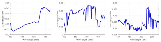 Average gradient of each band for the reference images. (From left to right: University of Pavia, University of Houston, and San Diego air station).