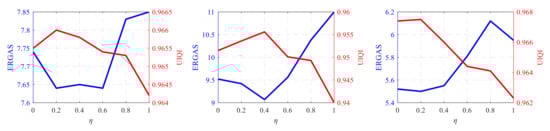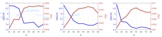 The ERGAS and UIQI values with respect to of UCNN. (From left to right: University of Pavia, University of Houston, and San Diego air station).