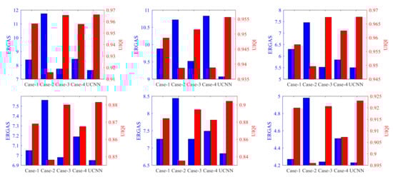 The experimental results of the three above-mentioned cases are reported in Figure 13, as well as the proposed approach. Obviously, from Figure 13, we can see that the proposed UCNN remains the best one in terms of both spectral fidelity and image quality. By comparing Case 1 and UCNN, it is apparent that incorporating the spatial correlation between HR and LR HS images into network learning indeed provides a favorable outcome, i.e., relatively lower ERGASs and higher UIQIs in all cases, with a limited increment in computation. Moreover, in the testing stage of HR abundances, in the upper branch of Figure 1, the prediction of LR abundances is no longer needed, which further reduces the computation time. Second, it can be inferred that the update of endmembers is indispensable, since the results of Case 2 deteriorated severely, e.g., in the left upper and right lower figures, Case 2 has a very high ERGAS value, with a much lower UIQI, compared with UCNN and the others. Fortunately, the update of endmembers requires much less time than the backward propagation in network training. Third, combing the results in Figure 11 and Figure 13, it can be seen that the involvement of abundance sparsity will also have a minor effect on the performance. A proper sparsity can further reduce the errors, enhance the image quality, and benefit the fidelity of super-resolved images, without any additional computation requirements. Lastly, by comparing the results of Case 4 and UCNN, it can also be concluded that predicting small pieces of patches provides more accurate results than the entire LR HS image with the original size, although more time may be needed for forward propagations.