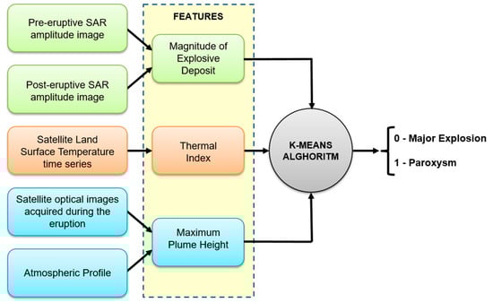 Workflow of the unsupervised classifier showing the transformation from satellite raw data to descriptive features that are then fed to the k-means algorithm. It provides a binary outcome, i.e., zero for Major Explosions and one for Paroxysms.