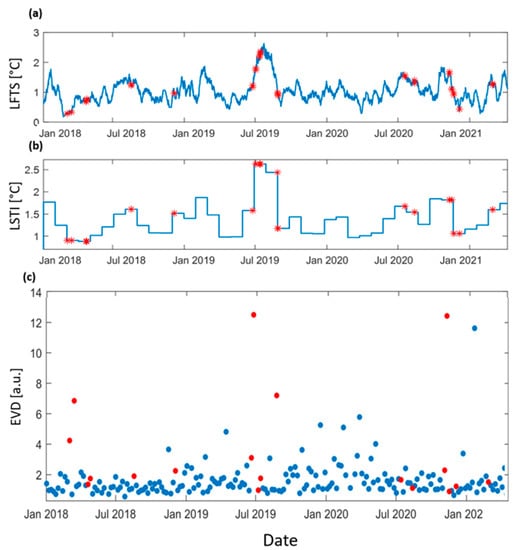 Time series of LFTS (a), LSTI (b), and EVD (c) values calculated from January 2018 to April 2021. (a,b) The red stars indicate the explosive events listed in Table 1. (c) EVD is computed for each Sentinel-1 acquisition (blue dots). EVD values corresponding to the investigated eruptive events are shown as red dots.