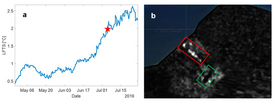(a) LFTS zoomed in the time interval from May to July 2019. The star highlights the 3 July 2019 paroxysmal event. (b) Change detection image showing explosive deposits and eroded area detected by using the ratio of Sentinel-1 SAR descending images. The amplitude ratio is calculated between the pre-eruptive image of 26 June 2019 and the post-eruptive intensity image of 8 July 2019. The red rectangle indicates the brighter pixels that are related to the biggest materials deposited (widespread pyroclastic density current, ballistics and tephra fallout) during the eruption, whereas the green rectangle indicates the darker pixels related to the removal of materials due to the crater area erosion after the eruption.