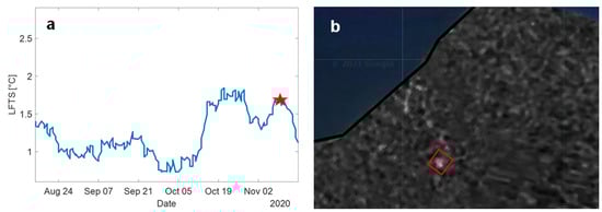 (a) LFTS zoomed in the time interval from August to November 2020. The star highlights the 10 November 2020 major event. (b) Change detection image showing explosive deposits by using the ratio of Sentinel-1 SAR descending images. The amplitude ratio is calculated between the pre-eruptive image of 5 November 2020 and the post-eruptive intensity image of 11 November 2020. The red square indicates the brighter pixels that are related to the biggest materials deposited after the eruption.