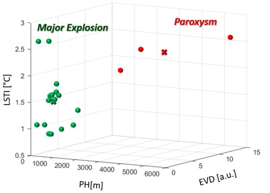 Using the values of three distinguishing features PH, EVD and LSTI, the input matrix X was populated for all 19 event samples (Table 3). Then, the input matrix X of dimension [19 × 3] was given to the k-means classifier that grouped the investigated events as is shown in Figure 7. Three events are clustered together in one class, whereas the remaining sixteen events are grouped in the other one. The cluster identified by the centroid with higher coordinates is representative of the more intensive explosions and is named “Paroxysm”, the other one characterized by the centroid with lower coordinates is named “Major Explosion”. The centroids are found by coordinates (PH, EVD, LSTI): Cp = [3330, 10.7, 2.3] for the paroxysms, and Cme = [420, 2.5, 1.4] for the major explosions. The three violent explosions classified as paroxysms are the 3 July 2019, 28 August 2019 and 16 November 2020 events, while the major explosions include the other sixteen episodes listed in Table 1.