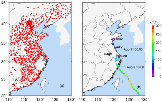 (a) Geographic distribution of GPS stations; (b) four matched GPS-RS stations (red triangles) and the path of Typhoon Lekima’s center (with interval of 6 h). The color of typhoon center denotes the maximum wind speed in km/h. The locations of typhoon center at 9 August 18:00 UTC and 11 August 00:00 UTC are labeled.