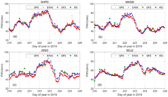PWV comparisons of GPS (red dots), ERA5 reanalysis (blue dots), GFS analysis (brown triangles) and radiosonde (RS) (green circles) at four match stations: (a) SDJZ, (b) JSSG, (c) MASM and (d) SHPD.