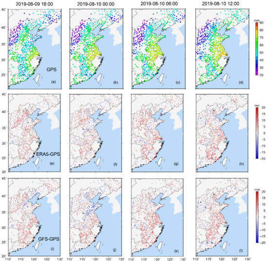 The spatial distribution of GPS and GFS PWV at different time epochs with a time interval of 6 h from 18:00 UTC on 9 August to 12:00 UTC on 11 August is presented in Figure 3 and Figure 4. We can find that PWV at stations in the east part is significantly larger than PWV at stations in the northwest part (below 40 mm). GPS PWV shows strong correlation with the typhoon process since the typhoon brings abundant water vapor from the ocean. The large PWV area moves with the typhoon but with the maximum values decreasing as part of the water vapor turns into precipitation. Compared with GPS PWV, we can also find the overall overestimation of PWV in ERA5 and GFS in the region influenced by the typhoon from Figure 3 and Figure 4. One of the possible reasons may be that water vapor information over land in ERA5 and GFS pressure-level products is mainly from the radiosonde data by assimilation where the radiosonde PWV is generally larger than GPS PWV, as shown in Figure 2. ERA5 agrees better with GPS than GFS in general. For example, the obvious underestimation of PWV between 35–40° N in GFS in Figure 3j does not exist in ERA5 in Figure 3f.