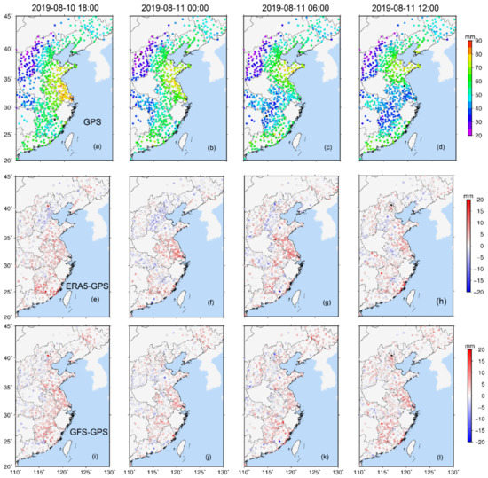 (a–d) PWV spatial distribution at UTC time 9 August 18:00, 10 August 00:00, 10 August 06:00 and 10 August 12:00, respectively; (e–h) PWV difference (ERA5 minus GPS) at the four epochs; (i–l) PWV difference (GFS minus GPS) at the four epochs.