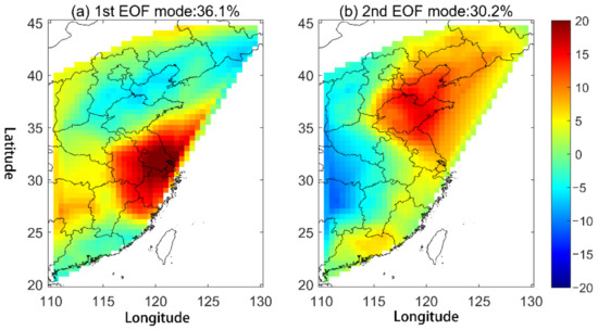 PWV values at all GNSS stations at each epoch were spatially interpolated to grid points with a spatial resolution of by bilinear interpolation method. An EOF analysis of the gridded PWV was then performed to study the leading modes of variability. Figure 5 presents the two leading EOFs along with the corresponding principal components (PCs), as shown in Figure 6. The two leading EOFs explain about 36.1 and 30.2% of the total variance, respectively, accounting for about 66.3% in total. The first EOF clearly shows distinctive large anomalies centered over the first typhoon landing location, and the corresponding PC depicts the main feature of the PWV variations similar to PWV time series at the station SHPD (near the first landing location) in Figure 2a where the PWV variations are dominated by the water vapor brought by the typhoon. The second EOF represents a dipole mode between the east and west part of the study region. The positive anomalies over the northeast are also contributed by the abundant water vapor carried by the typhoon when it made the second landfall on 11 August (DOY 223). We can also easily find the time lag of the peak values between the PC2 with PC1 due to the movement of typhoon, as shown in Figure 6. However, it is worthy to note that the EOF analysis in this work is only based on GPS PWV over land during the typhoon event. For more complete information for the entire typhoon path, especially over ocean, we can combine GPS PWV with microwave or ERA5 PWV, which is, however, out of the scope of this work.