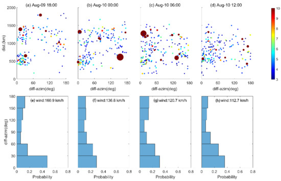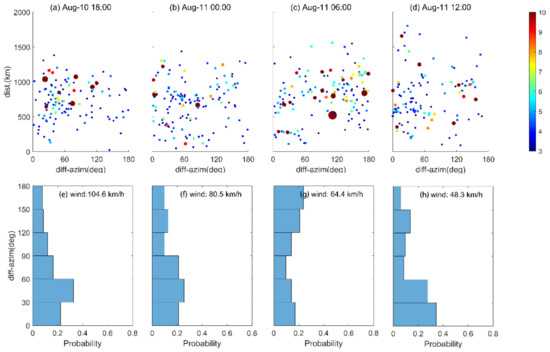 (a–d) Scatter of azimuth differences with distance between station and typhoon eye at UTC time 9 August 18:00, 10 August 00:00, 10 August 06:00 and 10 August 12:00, respectively; (e–h) probability histogram of azimuth differences at the four corresponding time epochs.