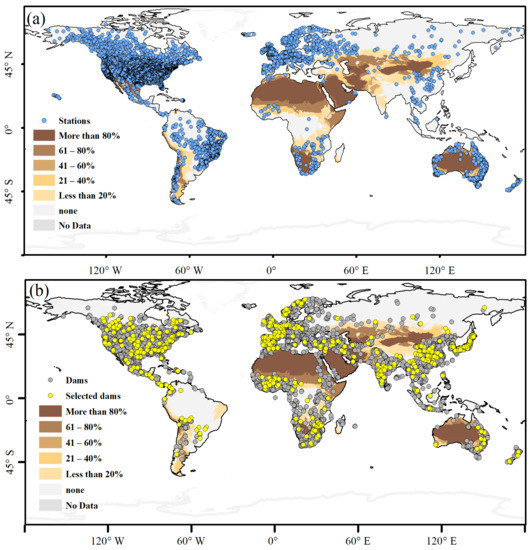 The spatial distribution of hydrological stations and dams. (a) The blue points indicate the selected the hydrological stations used in this study. (b) The global distribution of the dam is at the bottom. The grey points are the collected 7320 dams in the world, and the yellow points are selected 5182 dams located in the selected catchment boundaries from 1975 to 2017. Brown areas represent the arid regions of the world, and light and dark colors represent the percentage of arid land area.
