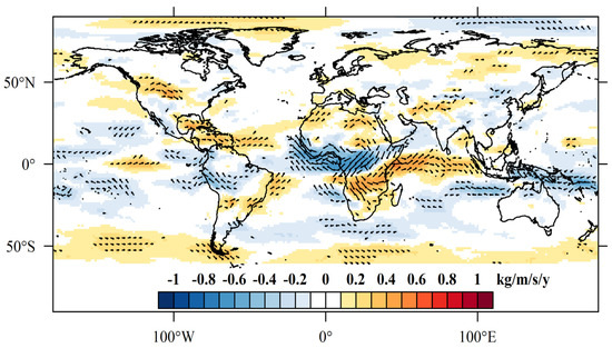 The nonparametric Mann–Kendall test [32,33] was used for trend significance detection, which can exclude the interference of abnormal values and is also applicable to data with abnormal distribution or nonlinear trends. The null hypothesis of this test is that data are identically distributed and independent. At present, the Mann–Kendall test is widely used for trend examination, which can capture the overall trend of time series, including the detailed trend in recent years [9,27]. In this study, we detected spatial and temporal patterns of trends in eight RS and three large-scale environmental variables, that is, geopotential height, horizontal wind, and water vapor flux. In addition, we also examined the trends in TWSA measured by NASA’s GRACE mission globally. The significance of the trend is set as the 0.05 confidence level.