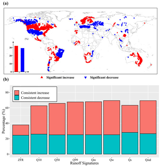 The extreme RS, ZFR, and Q99 show a SDT in more stations globally over the past decades, implying that the flood and the drought tend to decrease in more regions. In addition, more stations show a SDT for Qstd, implying that the interannual variability of streamflow tends to be more stable. Generally, the change direction (positive and negative) of most runoff signatures is usually consistent. This indicates that the runoff distribution tends to be entirely upward in some regions, while downward in other regions (consistently drier or wetter).