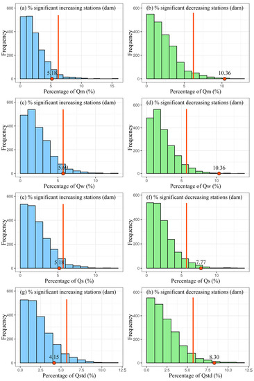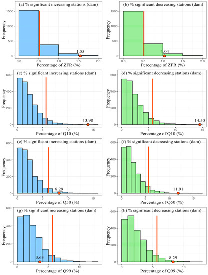 To evaluate the differential impact of dams on positive and negative trends of RS, we applied the Mann–Kendall test combined with resampling to investigate whether the proportion of stations showing an increasing/decreasing RS is significantly based on dataset A1 (dam-affected stations) [34]. The percentage distributions of dam-affected stations with significant trends are shown in Figure 7 and Figure 8. For low flow signatures, i.e., ZFR, Q10, and Q50, the percentage of stations with a SIT are close to that with a SDT. Specifically, the proportions of stations that show a SIT reach 1.55%, 13.98%, and 8.29%, while the percentages of stations with a SDT are 1.04%, 14.50%, and 11.91% for ZFR, Q10, and Q50, respectively. These low flow signatures show that the percentages of stations with a SIT/SDT are field significant and are inconsistent with the no-change null hypothesis. Additionally, this result indicates that the dams seem to have no material effect on the overall trend results of ZFR, Q10, and Q50.