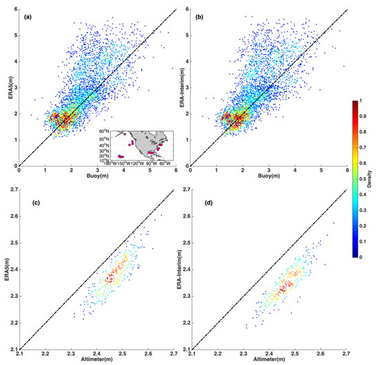 Correlation scatter plots of monthly SWH (units: m) with density from (a) ERA5 and buoy, (b) ERA-Interim and buoy, (c) ERA5 and altimeter, and (d) ERA-Interim and altimeter data. The ordinate represents the observed wave height, and the abscissa represents the reanalysis wave height. The small insert in the lower right corner of (a) shows the buoys’ geographical locations. The 14 buoys were provided by the NDBC. The root-mean-square error between the ERA5 and altimeter data was 0.09 m. The rms error of monthly averages between the ERA-I and altimeter data was 0.12 m. There were 288 monthly mean global SWH values from the altimeter and the reanalysis. Each buoy had 468 monthly mean SWH records.