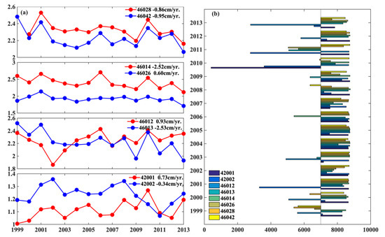 The trends in SWHs for another set of six coastal buoys near the USA-Northeast and two buoys in the Gulf of Mexico were examined (Figure 5a). The detailed information from these stations is listed in Table 2. Increasing SWH trends were apparent at Station 46026, Station 46012, and Station 42001. The other stations exhibited a negative trend from 1999 to 2013. The annual numbers of null values of the hourly measured wave height data were lower during this period (Figure 5b).