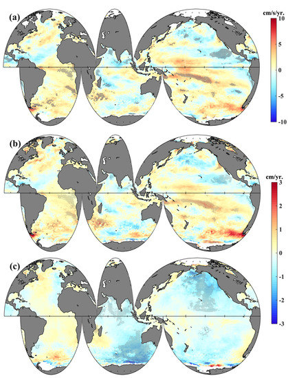 Figure 7a displays the spatial trend of global 10-m SSW speed from 1999 to 2013. The variations of SWH in the northern Indian Ocean, the area south of the Aleutian Islands, the eastern equatorial Pacific, and the waters surrounding Hawaii were positively correlated with SSW speed, and their trends were similar. Decreasing trends of 10-m SSW speed were found in the Arabian Sea and the Bay of Bengal (−6 cm/s per year). The negative patterns in these seas were the same as those of SWH, as shown in Figure 2d. In the equatorial Pacific Ocean, large regions of the northern Pacific, Indian Ocean near Australia, and the mid-latitudes of the southern Atlantic Ocean demonstrated negative trends. The surface wind trend grew more slowly or even reversed in the northern Pacific, the Indian Ocean, the Caribbean Sea, the Scotia Sea, and the waters surrounding Hawaii compared to the first 20 years (1979–1998) of the study period (Figure A2a).
