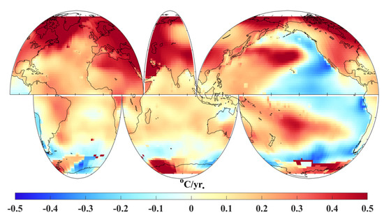 Spatial distributions of GMST linear trend with respect to the 1979–2013 average during the global warming slowdown period (data source: the land surface air temperature is from GHCNv4 [43] and the sea surface temperature is from ERSSTv5 [44]).