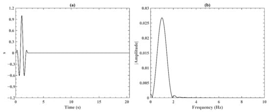 The acoustic source function of the seismic source: (a) the waveform of s0(t) in the time domain; and (b) the frequency spectrum of s0(t).